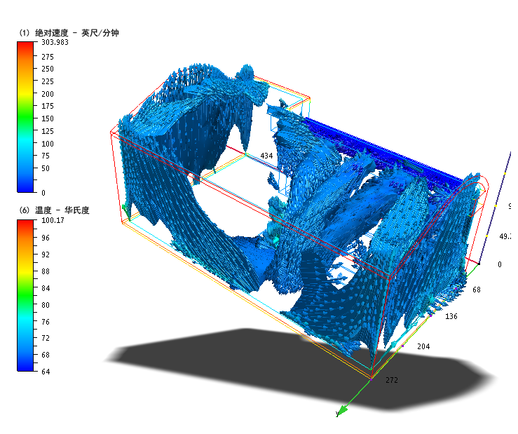 注: 在此步骤中,我们使用速度作为等值量并用温度结果为其着色,从而创建了一个等值面。还可以使用温度作为等值量,从而了解很多关于热能的知识。这样做可以显示具有相同温度的区域,这对于确定温度和空气流量趋势非常有用。