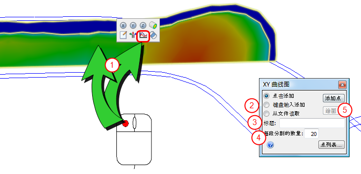 在切面上选择点、输入点坐标或从以前的曲线图中获取保存的点,以创建 XY 曲线图。任何 XY 曲线图中的最大点数量均为 500。