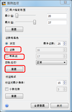 8. 试着修改标签格式和小数位数。单击全部重置,然后单击关闭退出“图例”对话框。