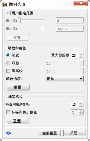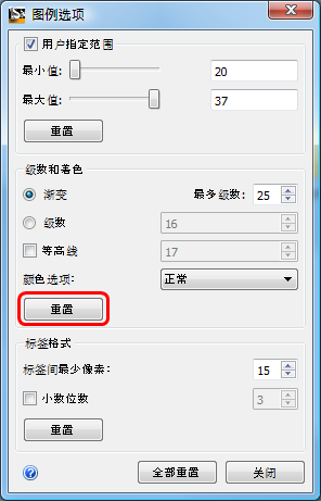 6. 在“图例选项”对话框中,启用“用户指定范围”。使用最低和最高滑块调整图例范围(以查看这样会对结果显示产生怎样的影响)。完成后单击重置。