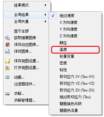 3. 若要显示模型上的温度,请单击鼠标右键,然后选择“全局结果”。从列表中选择“温度”。