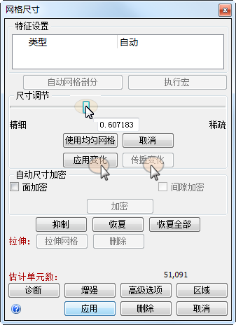 在本步中,我们将使用“自动剖分网格”来设置网格分布。然后在流道和阀芯上加密网格。以此来确保网格足以进行运动分析。