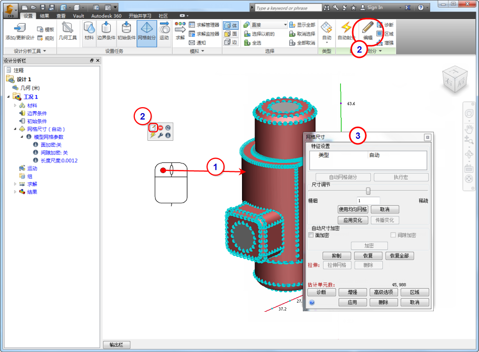 模型上大多数复杂的网格分布是通过一系列的命令和优化定义的。因为每个设置都可以在“历史记录”中找到,所以可以很容易地修改网格定义中的某个特定设置。