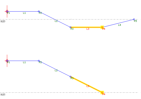 在此範例中,使用Auxiliary Point取得 P1 與目標地形之間的距離。首先,距離決定 P1 為挖方或填方條件。接下來,使用挖方和填方分支下的決定來確定填方的高度或挖方的深度。最後,以為條件指定的坡度繪制 P2 和 L1。