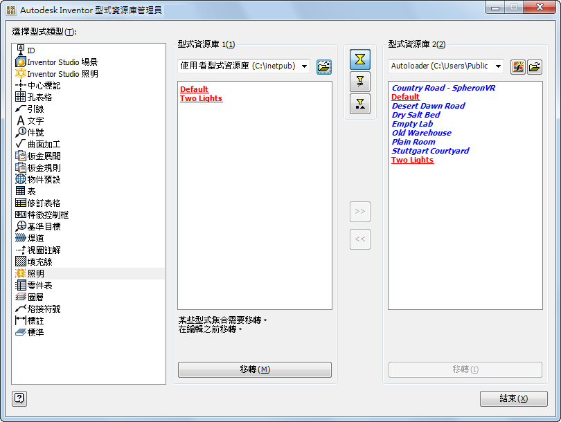 - 如果您僅加入或修改了幾種型式,建議您使用型式資源庫管理員將這些型式移動到新安裝的 Inventor 的型式資源庫中,如本文件中所述。