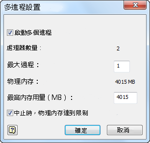 - 工作排程支援多個程序,可縮短移轉時間。在「設定」功能表中,按一下「多個程序...」按鈕,以開啟「多程序設定」對話方塊 (請參閱圖 1)。