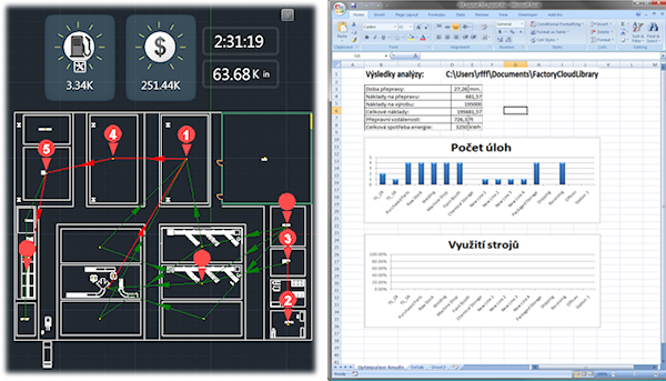 Rozvržení výrobní linky lze analyzovat a určit tak náklady na přepravu a míru využití strojů. Poté lze rozvržení upravit a znovu analyzovat za účelem jeho optimalizace.