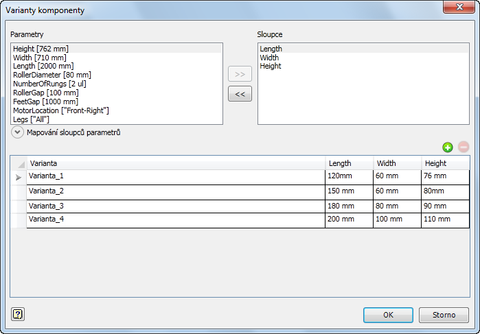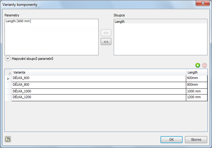 vytvořte v tabulce první variantu. Název varianty se v seznamu variant zobrazí jako Varianta_1 a ve sloupci Délka se zobrazí hodnota 600 mm.