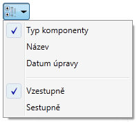 Vyhledávání komponent lze urychlit, pokud komponenty seřadíte podle typu, názvu nebo data změny. Můžete si také vybrat, zda se seřazené komponenty zobrazí ve vzestupném (výchozí nastavení) nebo v sestupném pořadí. Vybraný způsob řazení je trvalý. To znamená, že zůstane v platnosti i během následujících relací aplikace Inventor Factory. Klikněte na šipku dolů na ikoně