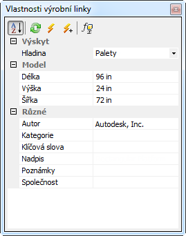 - V návrhu rozvržení výrobní linky vyberte komponentu, u které chcete změnit hodnoty parametrů. (Chcete-li vybrat více komponent, stiskněte a podržte stisknutou klávesu CTRL.) Jakmile je komponenta vybrána, lze v Prohlížeči vlastností výrobní linky upravit všechny zobrazené hodnoty. V Prohlížeči vlastností výrobní linky jsou uvedeny pouze ty parametry modelu, které byly při publikování zadány jako klíčové parametry. V Prohlížeči vlastností výrobní linky je uvedeno pouze několik vybraných parametrů iVlastností. Mezi tyto parametry iVlastností patří: název, nadpis, autor, společnost, katalog, klíčová slova a komentáře.