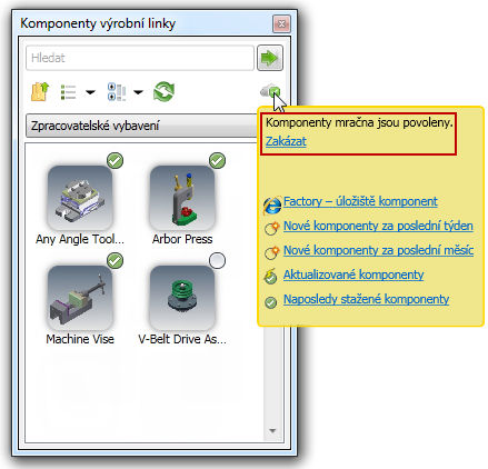 skladu komponent výrobní linky. Další informace o publikování místních komponent nebo komponent z cloudu naleznete v tématu nápovědy k aplikaci Inventor Factory:
