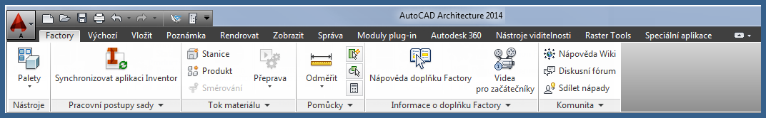 Uživatelské rozhraní aplikace Factory Design Utilities se nachází na kartě Factory a obsahuje panely Nástroje, Pracovní postupy sady, Tok materiálu, Pomůcky, Informace o doplňku Factory a Komunita. Výchozí pracovní prostředí sady nástrojů Factory tvoří kombinace panelů aplikace Factory a standardních panelů aplikace AutoCAD.