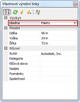 - Název hladiny vybrané komponenty se zobrazí v horní části Prohlížeče vlastností výrobní linky. Pokud jste vybrali více komponent v různých hladinách, názvy hladin se budou zobrazovat jako *více hodnot*.