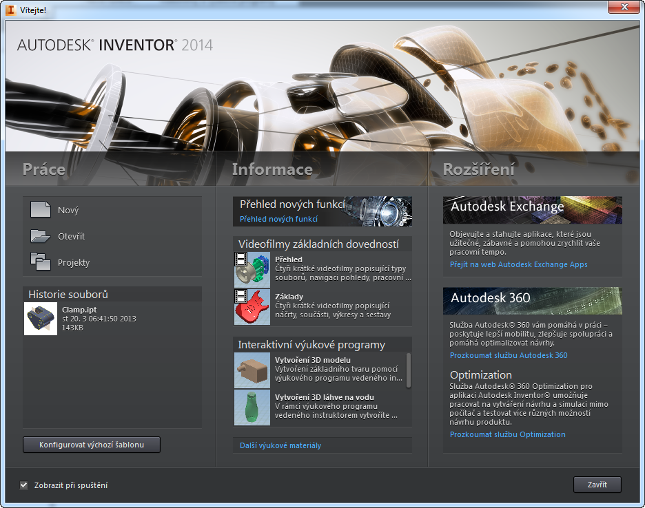 Pokud je aplikace Autodesk Inventor LT ve stavu bez dokumentů (nejsou otevřeny žádné soubory), příkaz Projekty lze spustit přímo na úvodní obrazovce.