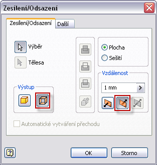 - V dialogu vyberte v poli Výstup položku Povrch. Zadejte hodnotu vzdálenosti 3 mm. Pomocí šipky pro obrácení směru odsaďte povrch směrem dovnitř součásti.