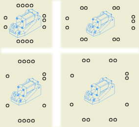 Přesuňte kurzor na list výkresu. Když pohybujete kurzorem, pozice se uspořádají blíž ke středu pohledu nebo dál od něj. Vertikální řádky se pohybují na základě horizontální pozice kurzoru vzhledem ke středu pohledu. Horizontální řádky se pohybují na základě vertikální pozice kurzoru vzhledem ke středu pohledu. Následující obrázek ukazuje čtyři možné pozice pomocí možnosti Okolo.