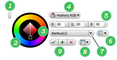 - přepínač barevných režimů RGB nebo HSB (odstín, sytost, jas),