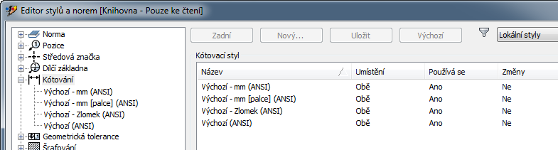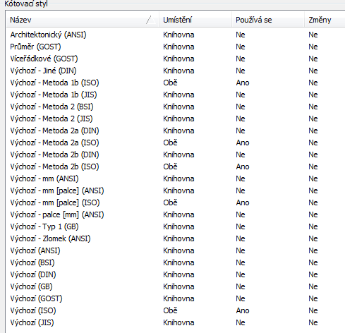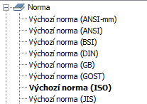 V prohlížeči seznamu Norma se zobrazují všechny normy, které jsou k dispozici v knihovně stylů. Výchozí norma (ISO) je označena tučným písmem, což znamená, že je právě aktivní ve výkresu.