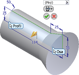 Jiným způsobem zadání explicitní úhlové hodnoty do textového pole je kliknutí na zlatý šipkový manipulátor rotace. Pak dynamicky táhněte profil náčrtu okolo osy rotace.