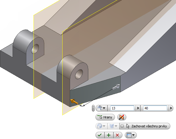 Spusťte příkaz Zrcadlení. Vyberte prvky k zrcadlení – vysunutí a průchozí díra. Vyberte ve středu součásti pracovní rovinu k zajištění podmínek výběru roviny zrcadlení.