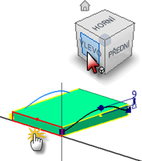 Spusťte příkaz Spline a načrtněte spline od středu promítnuté svislé čáry do bodu nad středem součásti. Koncový bod umístěte do středu pro tější svislé čáry. Dvojitým kliknutím na poslední bod vytvořte spline.