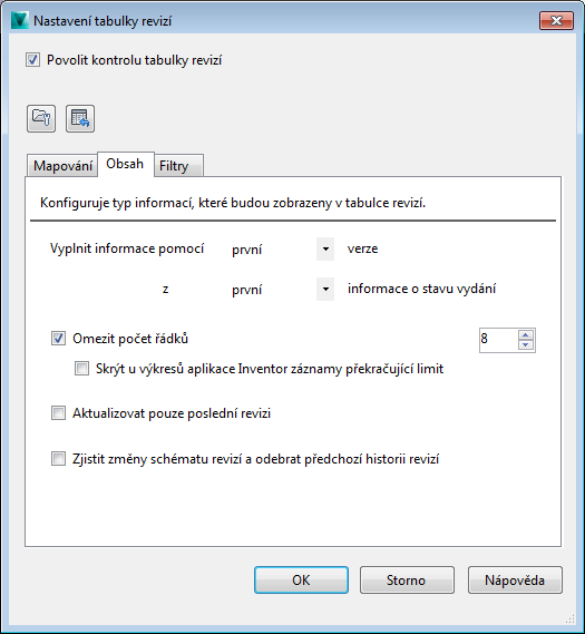 Při práci s revizemi je možné mít v rámci jedné revize více verzí výkresu. Na kartě Obsah můžete určit, zda se v tabulce revizí mají zobrazovat data první nebo poslední verze revize.