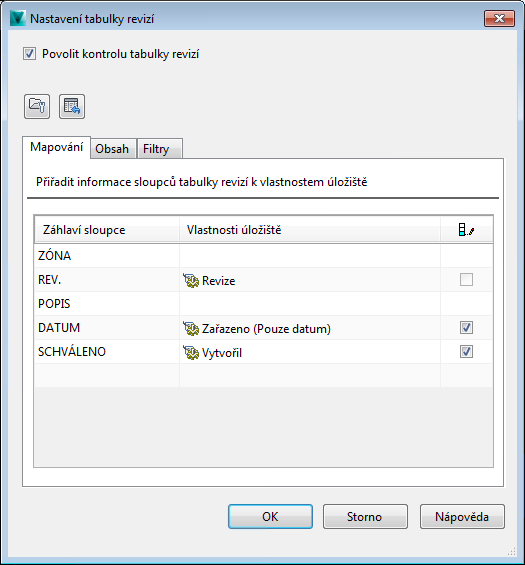 Dialog Nastavení tabulky revizí (úplné zobrazení)