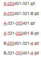 Pokud jako kritérium vyhledávání zadáte výraz A055* a faktor tolerance nastavíte na hodnotu 3, získáte 5 výsledků. Opět platí, že rozsah úpravy je menší než v předchozím příkladu, ale výsledky budou stejné a soubor B-055401-321-A.ipt bude vyloučen: