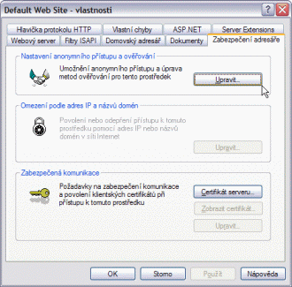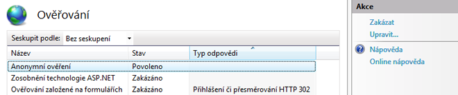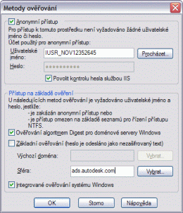 - Dialog Metody ověření zobrazí uživatelské jméno anonymního účtu používaného službou IIS. Zkontrolujte, zda tento účet existuje na serveru.