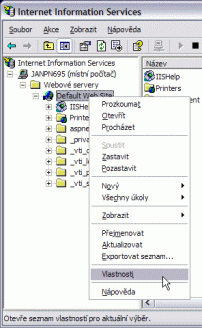 - Klikněte pravým tlačítkem myši na položku Výchozí webový server a z místní nabídky vyberte položku Vlastnosti.