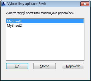 - Pokud neodpovídá počet listů v souboru připomínek DWFx počtu listů v hostitelském modelu, zobrazí se dialog Vybrat listy aplikace Revit.