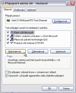 - V dialogu vlastností místního připojení klikněte na tlačítko Instalace.