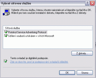 - V dialogu Výběr síťové služby vyberte položku Sdílení souborů a tiskáren v sítích systému Microsoft.