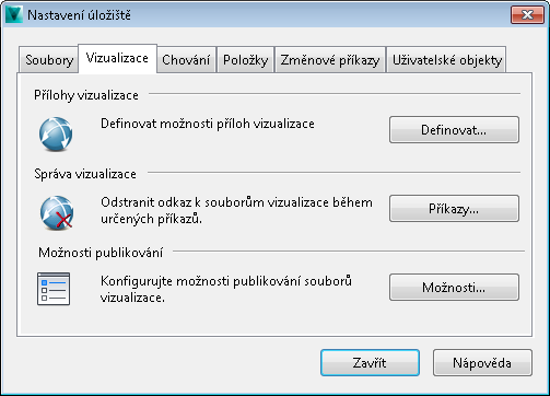 Karta Vizualizace v dialogu Nastavení úložiště obsahuje možnosti pro konfiguraci příloh vizualizace, správu souborů vizualizace a konfiguraci nastavení publikování.