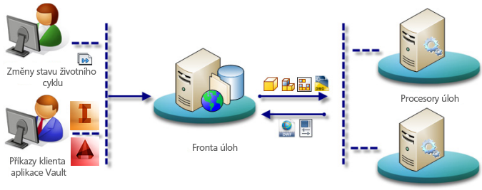 - Fronta úloh je fronta nebo seznam úloh odeslaných klienty (aplikace Inventor, AutoCAD, Vault a Autoloader) a čekajících na zpracování.. Tato fronta je uložena na serveru úložiště a je jím také spravována.