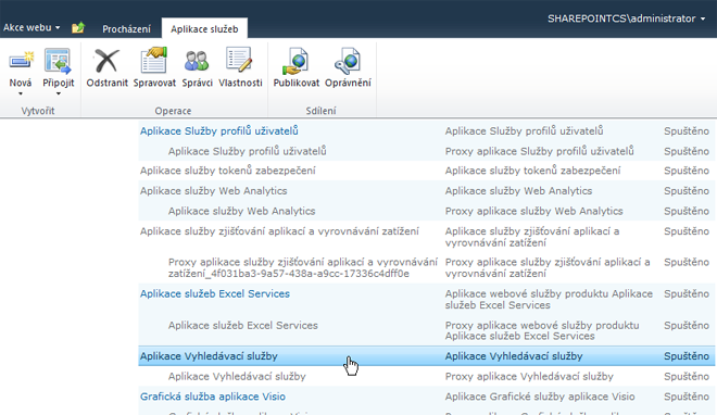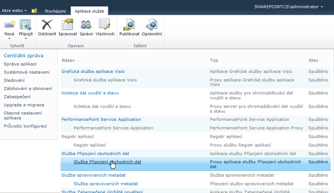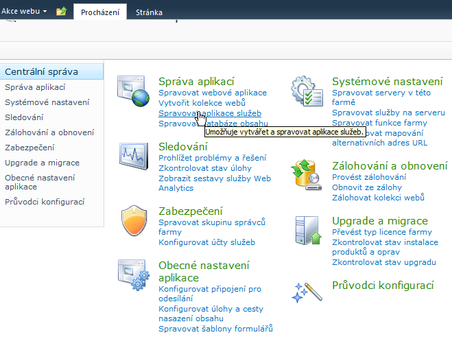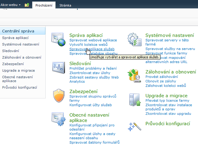 Přejděte do centrální správy a ve Správě aplikací klikněte na položku Správa aplikací služby.
