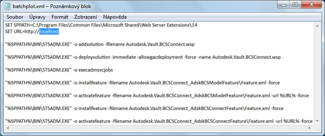 Soubor deployFarm.bat rozmístí řešení služby SharePoint (model BCS) a ve farmě vytvoří webovou stránku Nastavení aplikace Vault. Soubor deploySite.bat podporuje rozmístění tři výchozích seznamů do konkrétní kolekce webů. Před použitím souboru deploySite.bat je nutné v každém dávkovém souboru upravit cestu. Postup při úpravě cesty je podrobně popsán v následující části.