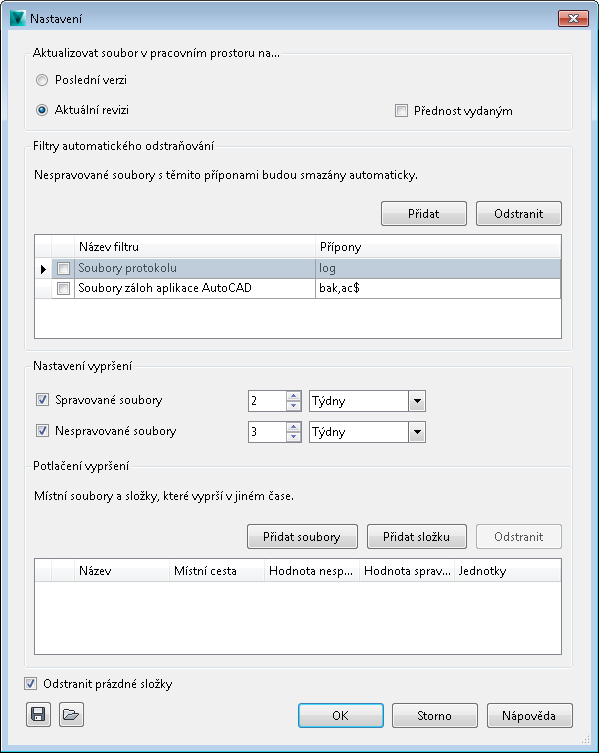 Tyto filtry slouží k určení typů souborů nespravovaných úložištěm, které jsou z pracovního prostoru odstraňovány automaticky. Během synchronizace bude odstraněn kterýkoliv soubor v pracovní složce, který má danou příponu souboru. Ve výchozím nastavení jsou dodány a vypnuty dva filtry: soubory protokolu (.log) a soubory záloh aplikace AutoCAD (.bak, ac$).