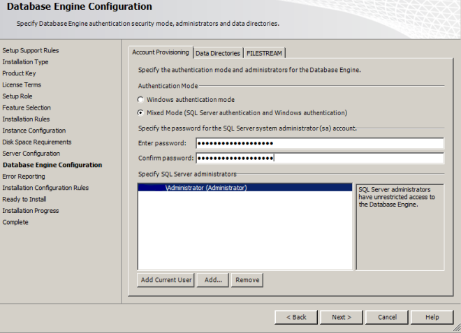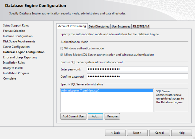 - V okně Konfigurace enginu databáze vyberte kartu Zřizování účtu.