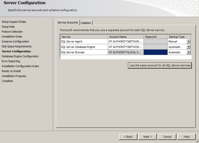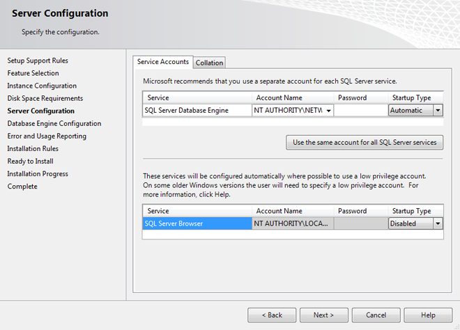 - Pro engine databáze systému SQL určete účet NT AUTHORITY\NETWORK SERVICE. Je možné použít také místní systémový účet. Pokud se chystáte provádět zálohování a obnovování ve vzdálených umístěních, určete účet uživatele domény. Nastavte Typ spouštění na hodnotu Automaticky.