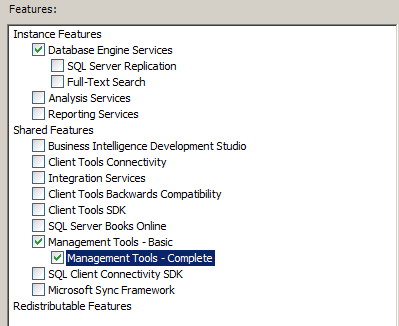 - Vyberte Služby enginu databáze a jakékoli další role požadované v daném prostředí. V prostředí propojených pracovních skupin je vyžadována replikace serveru SQL a doporučují se nástroje Management Tools. Ve verzi Express systému SQL Server jsou k dispozici pouze nástroje Management Tools – Basic.