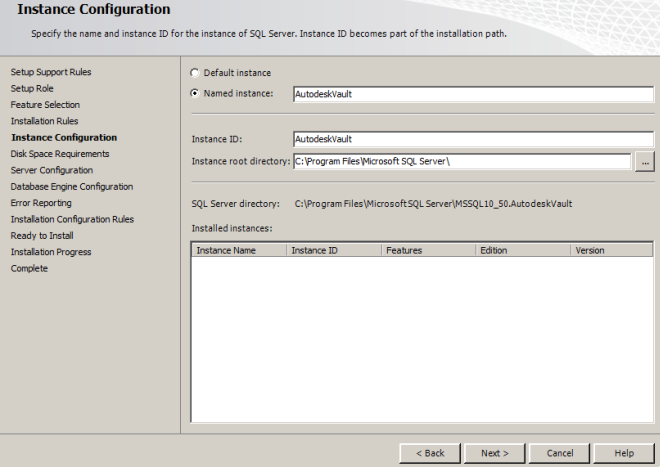 Poznámka: Pokud nainstalujete server SQL bez použití tohoto názvu instance, instalace aplikace Autodesk Vault Server vytvoří vlastní instanci serveru SQL s názvem AutodeskVault pomocí systému Microsoft SQL Express 2008 SP2. Instance systému SQL, které nejsou pojmenovány AutodeskVault, nebudou rozpoznány.
