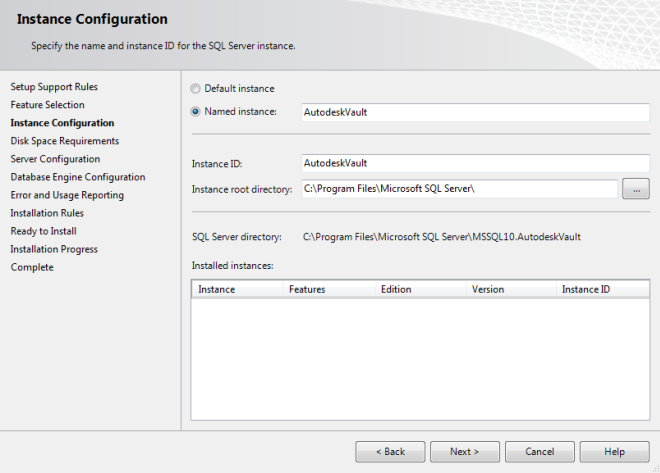 - V okně Konfigurace instance vyberte položku Pojmenovaná instance a zadejte název AutodeskVault.