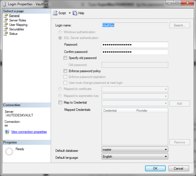 Aplikace Autodesk Vault také vytvoří uživatelský účet serveru VaultSys SQL pro transakce SQL. Toto heslo lze změnit pouze pomocí aplikace SQL Server Management Studio. Toto heslo je také uloženo v souboru web.config, který se nachází v adresáři <cesta instalace>\ADMS Edition 20XX\Server\Web\Services.