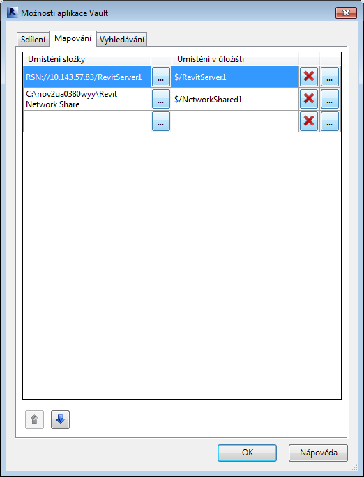 V dialogu Možnosti aplikace Vault na kartě Mapování namapujte jakoukoli místní nebo síťovou složku, popřípadě složku serveru Revit, na složku aplikace Vault.