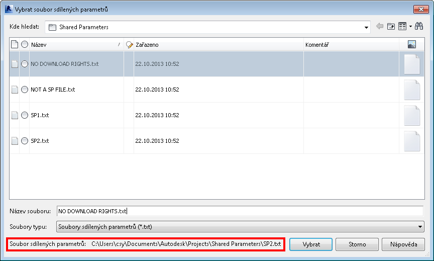 Aktuálně aktivní soubor sdílených parametrů bude zobrazen v levé dolní části dialogu Vybrat soubor sdílených parametrů.