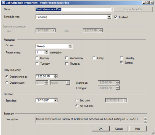 - V dialogu Vlastnosti plánu úloh nastavte spuštění plánu po dokončení zálohování serveru Autodesk Vault. V závislosti na velikosti vaší datové sady může být nutné tento plán spustit v jiném čase jiný den v týdnu. Úlohu můžete spustit v sobotu a přitom určit dobu potřebnou k jejímu dokončení. Pak se můžete rozhodnout, který den a čas bude nejvhodnější k pravidelnému spouštění úlohy.