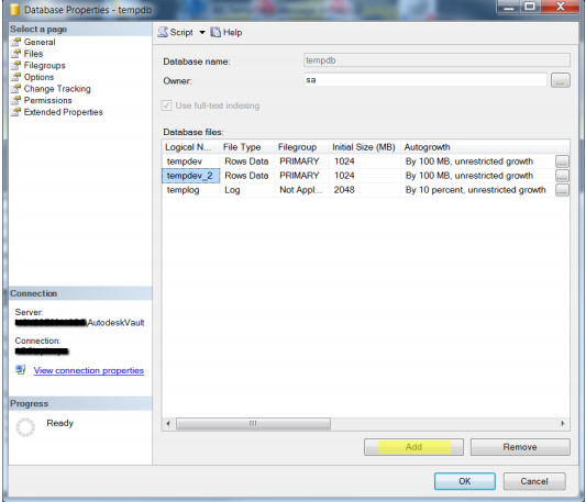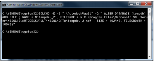 SQLCMD -E -S ".\AutodeskVault" -Q " ALTER DATABASE [tempdb] ADD FILE ( NAME =