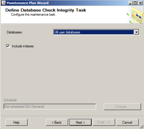 - V dialogu Definice úlohy kontroly integrity databáze vyberte v rozevíracím seznamu položku Všechny uživatelské databáze a zaškrtněte políčko vedle položky Zahrnout indexy.