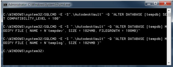 SQLCMD -E -S".\AutodeskVault" -Q "ALTER DATABASE [tempdb] SET COMPATIBILITY_LEVEL = 100"